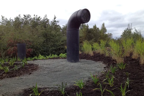 Ishøj lays soil at Store Vejleå’s mouth at Køge Bay. When the ice disappeared from Denmark, and later the rest of Scandinavia, the sea was 3 metres higher than it is now. This is revealed by shells from saltwater mussels and snails. Later on, the land rose by 3 metres – straightening out when the pressure from the ice was gone – and Ishøj reached its current height. In Kondiskoven forest, the sculpture is hidden between the young trees on the river bank. A small piece of forest with a rich bird and insect life, which offers a sense of nature (naturalness), yet is in stark contrast to the concrete-built sculpture. It plays on the perception that it could always have been there. The passing of time and changing landscapes cover the layers, and we may be in doubt as to what came first.