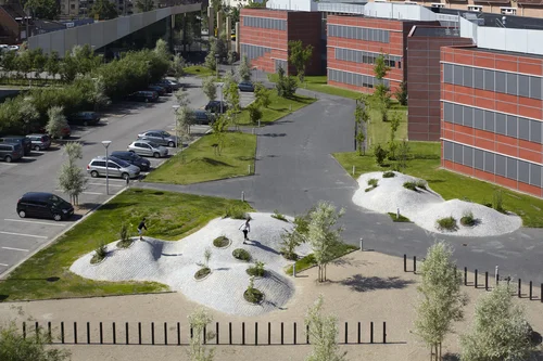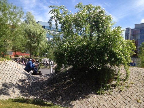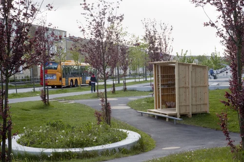 A dense urban space dominated by infrastructure. It is often a network of roads that delineate the landscapes. At a traffic light controlled intersection, there is a small area with grass, and some trees framed by roads and pathways – an area left over from urban planning, where roads and buildings have grown in between each other. Here, the presence of a glacial erratic rock would be beyond our sense of order. It could have appeared during one of the countless excavations carried out in the urban space. First as a small stone, then as a giant. And would most definitely be in the way. It therefore seems both surprising, but also credible, that a sculpture in the form of a glacial erratic rock would be located here, where it references the infrastructural reality that today’s layers spread across the landscape. Here you can see how the suburb has emerged: an old road expanded over time, newer infrastructure, residential blocks and institutions, which gradually become wedged between the existing buildings, roads and facilities. Here, the sculpture becomes a tranquil axis, around which traffic travels and man-made buildings and facilities are created.